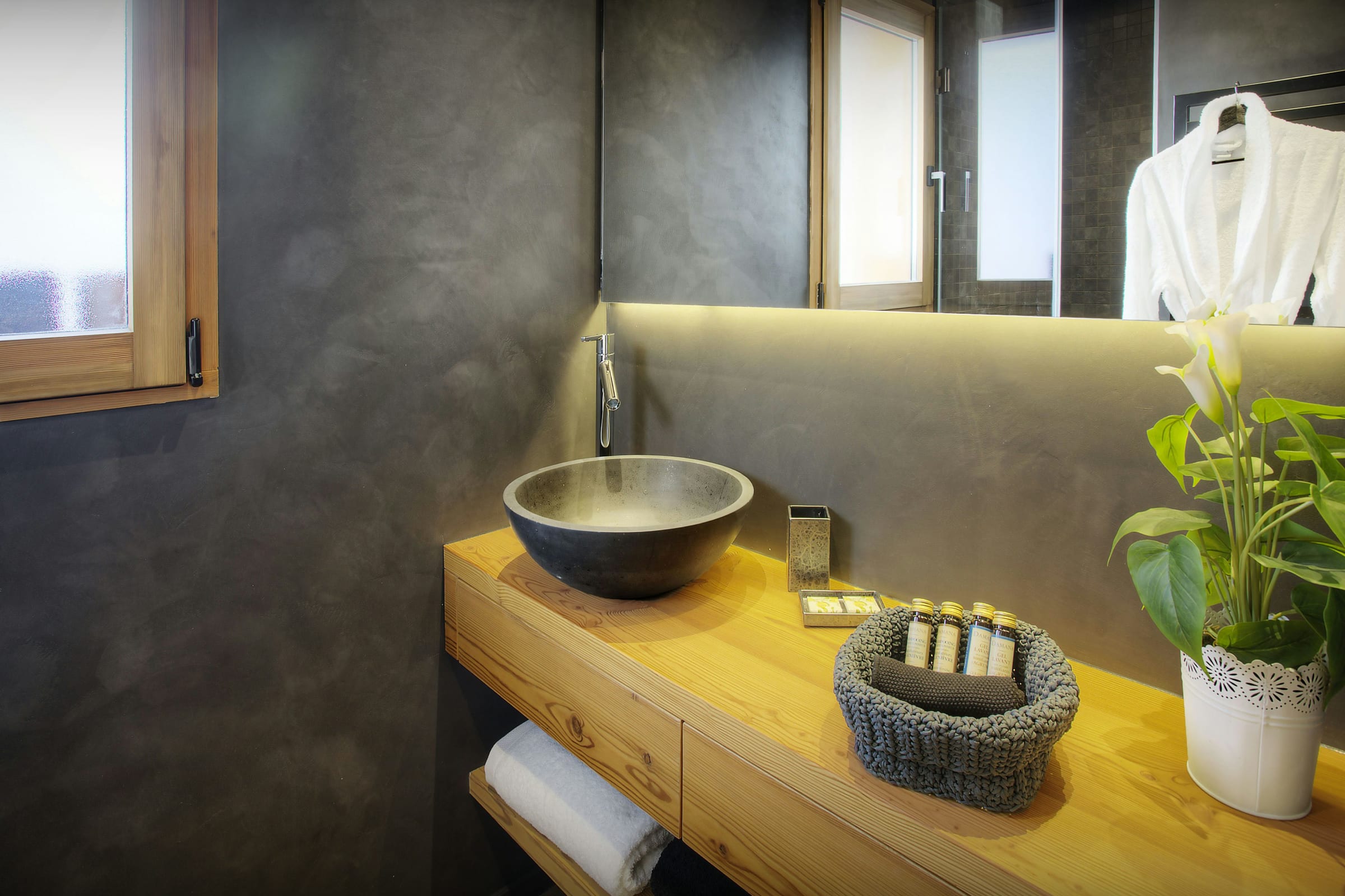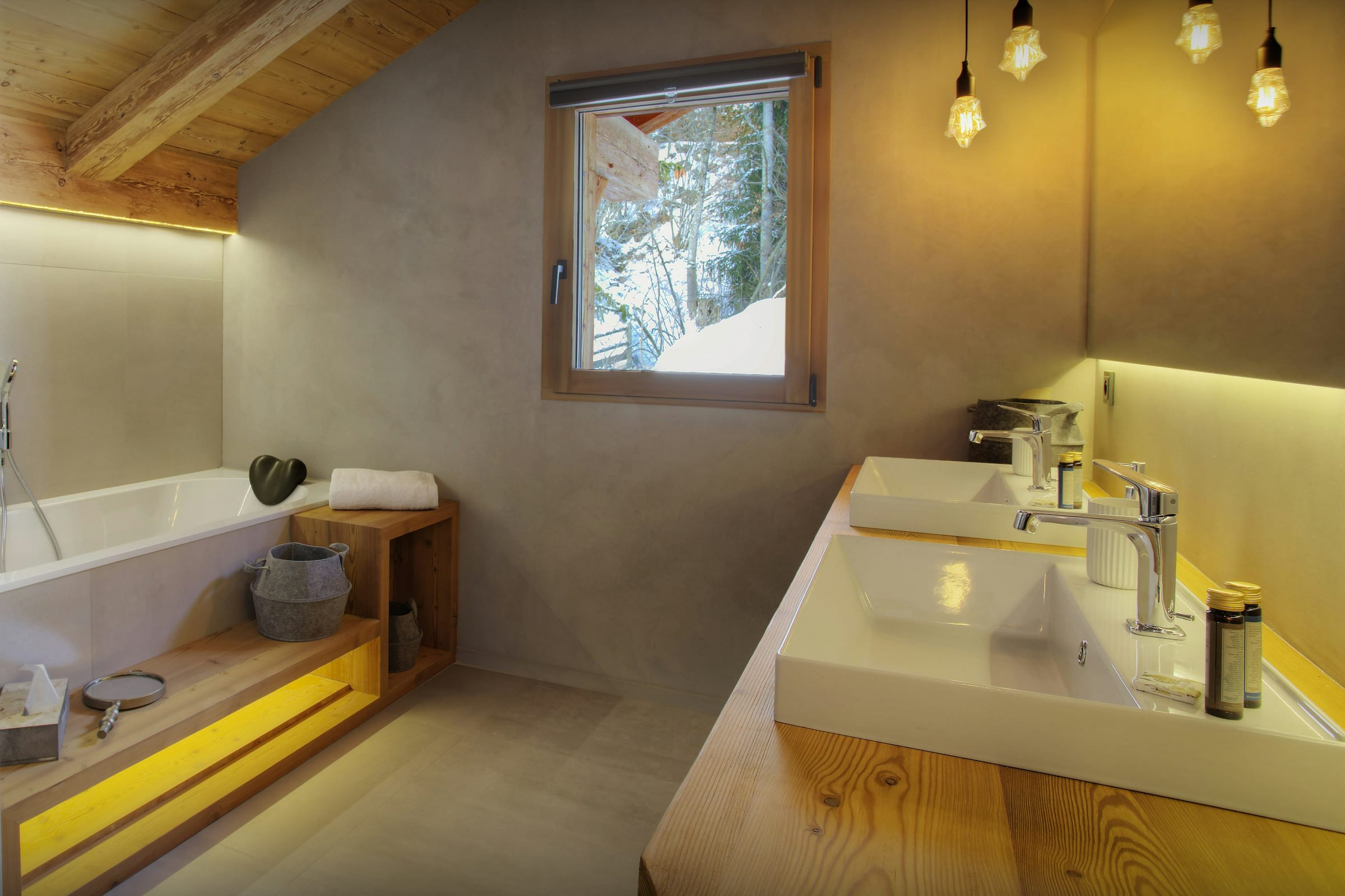 Das Chalet liegt auf einem Hanggrundstück und verfügt daher nur über wenige zugängliche Grünflächen. Zwei große Terrassen ermöglichen jedoch den Genuss der herrlichen Aussicht. Eine dient zum Entspannen und Genießen des Panoramas vom Whirlpool aus, die andere zum gemütlichen Beisammensein mit Freunden bei einer guten Flasche Wein.