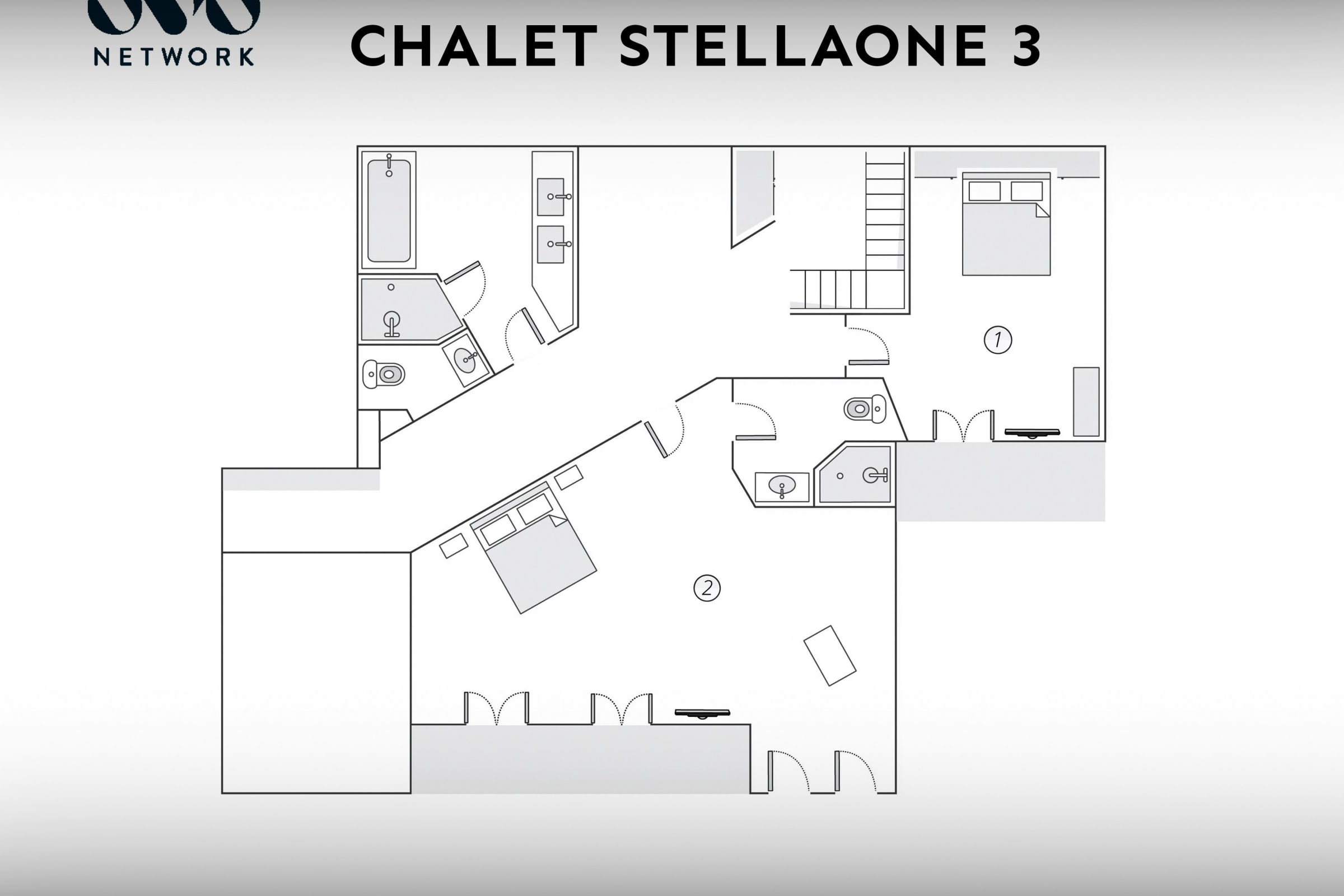Das Chalet Stellaone ist eine Unterkunft des OVO Network. Es bietet Platz für 12 Personen (8 Erwachsene) mit 4 Schlafzimmern und 5 Badezimmern auf 4 Ebenen sowie einem Zwischengeschoss, das in einen Schlafbereich umgewandelt wurde.
