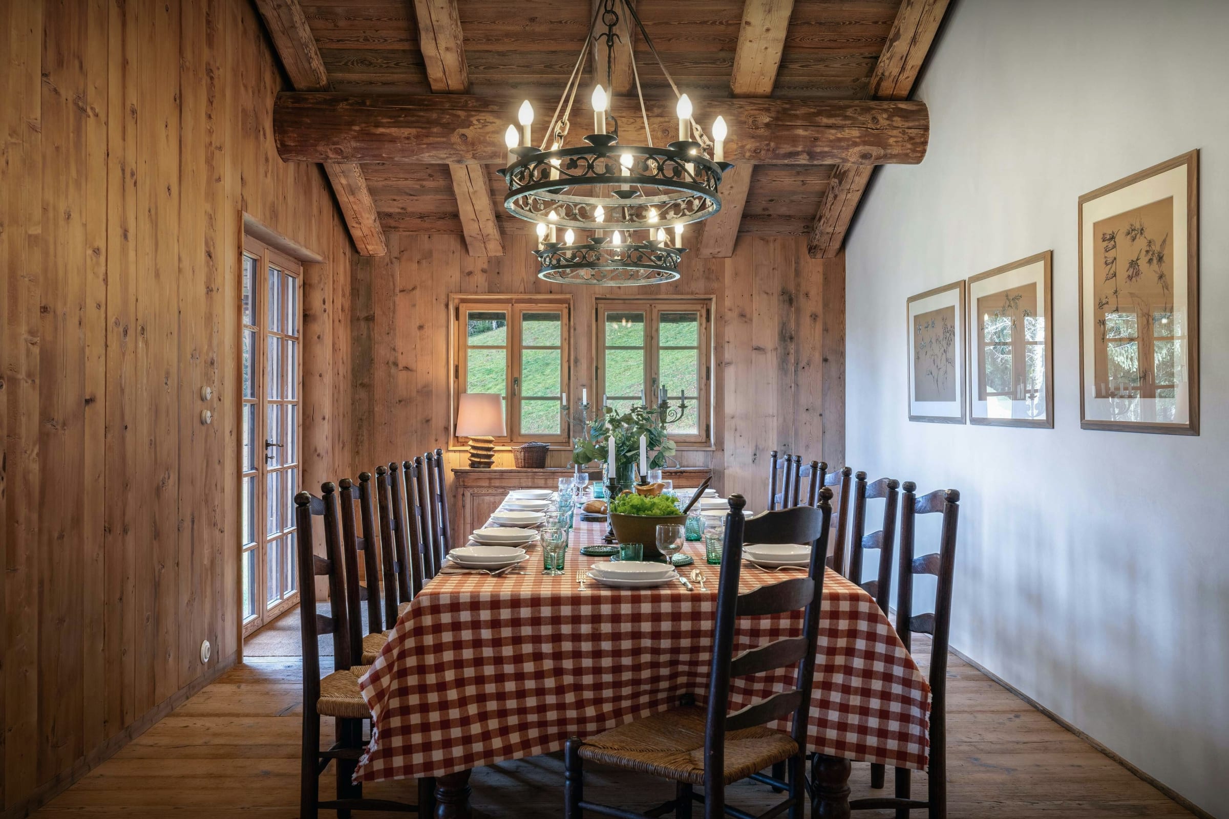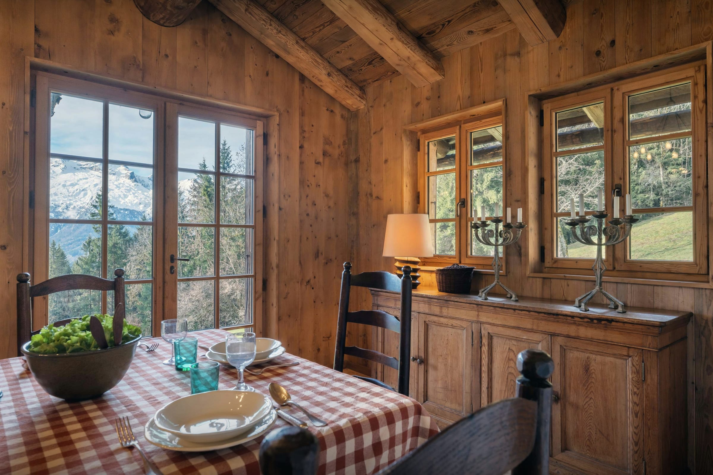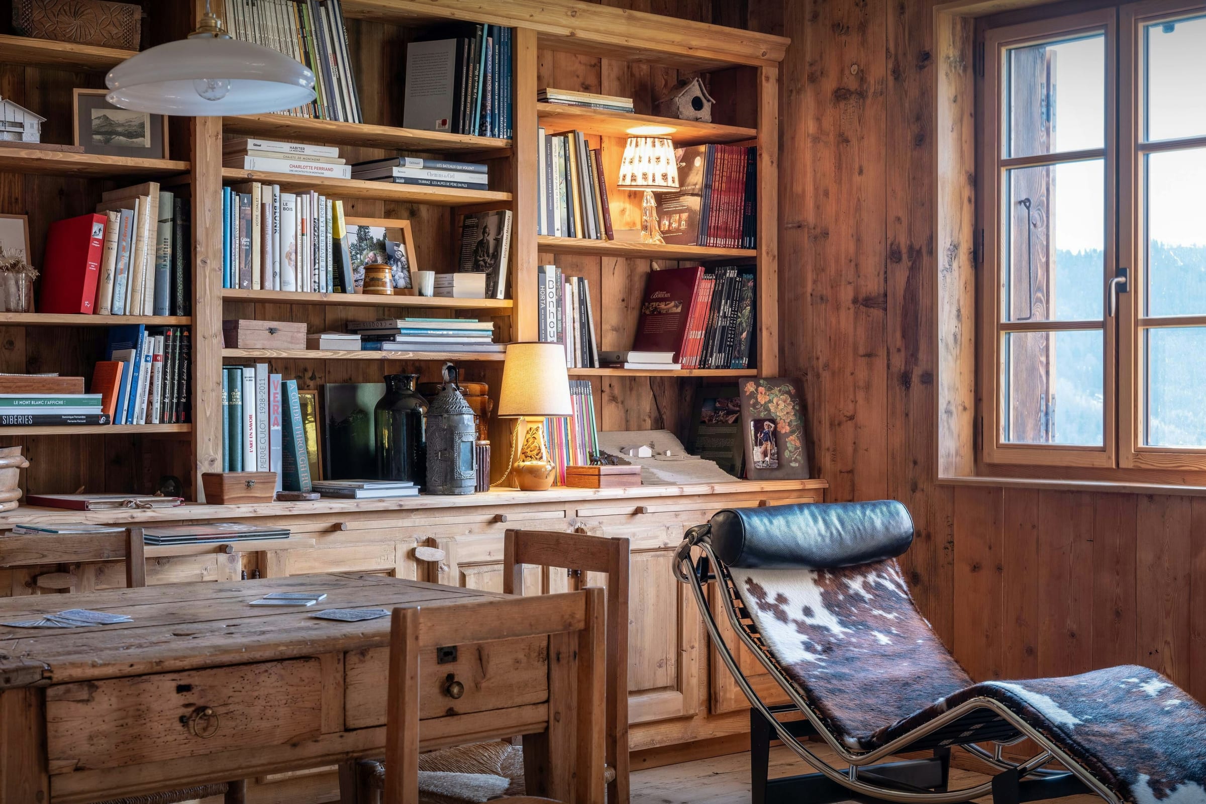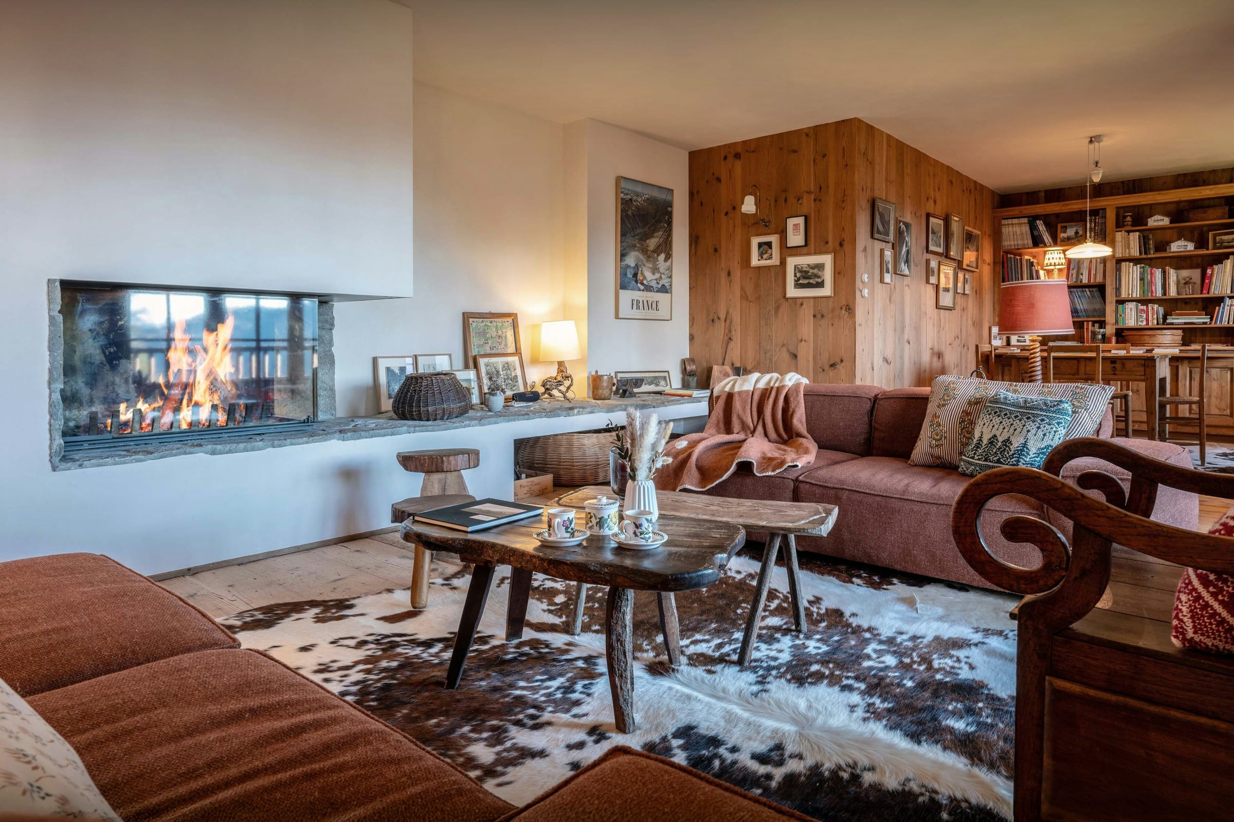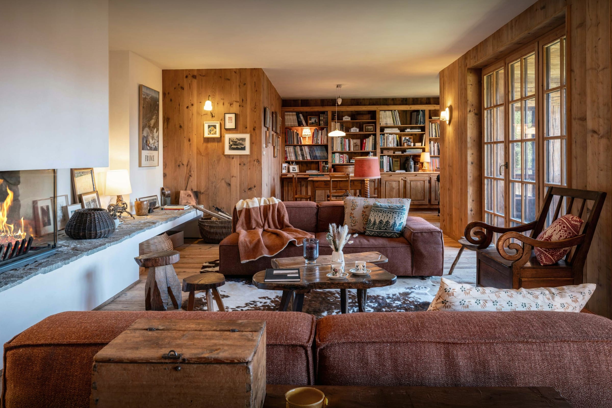 Das Wohnzimmer dieses ehemaligen Bauernhauses aus dem Jahr 1805 besticht sofort durch seinen rustikalen Charme und seine behagliche Atmosphäre. Rund um den Kamin laden die Sofas zu gemütlichen Abenden ein, bei denen man ein Buch aus der griffbereiten Bibliothek zur Hand hat. Durch die Flügeltüren des Balkons strömt viel Licht herein und bietet einen atemberaubenden Blick auf den Tournette-Berg.