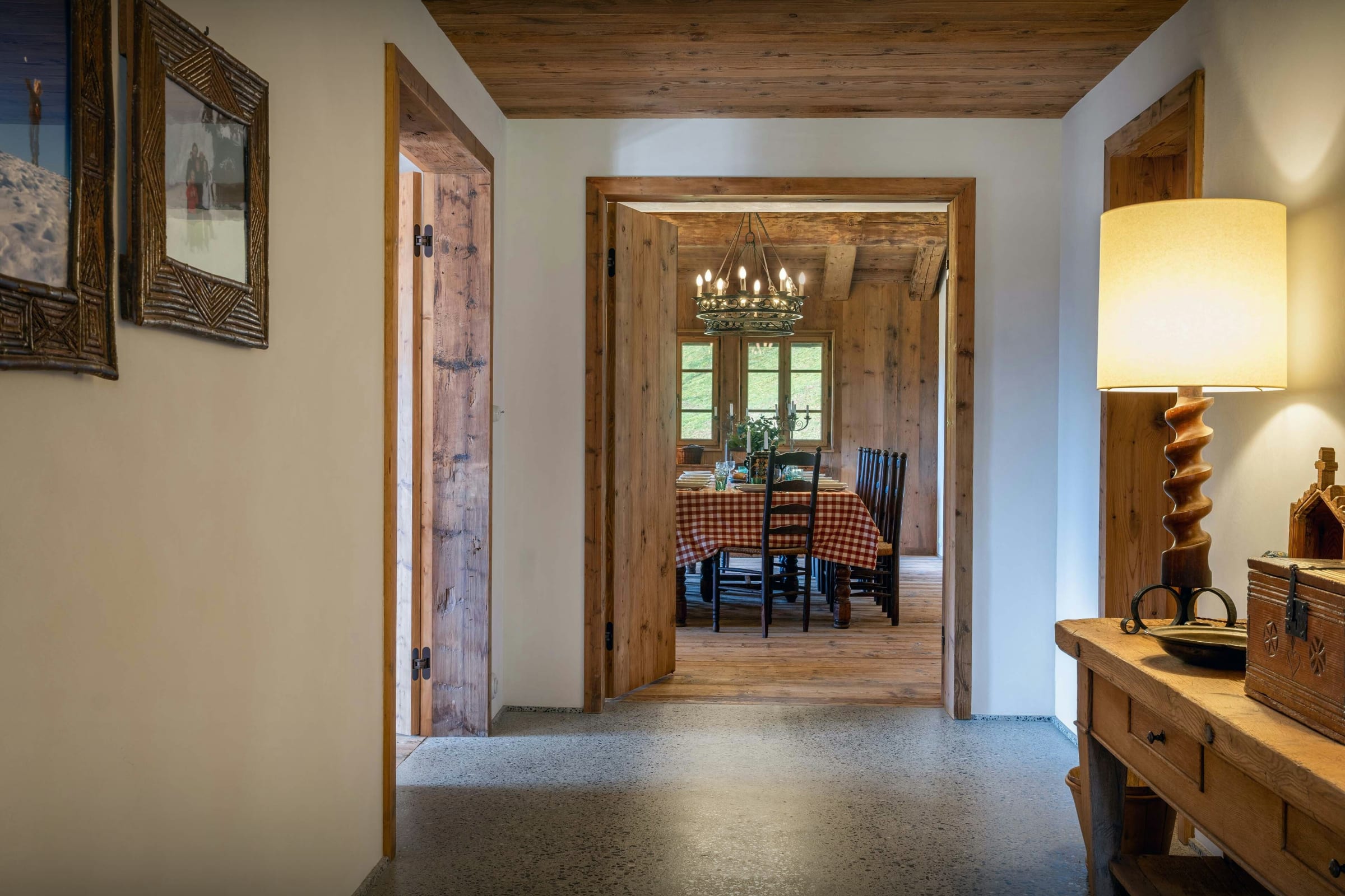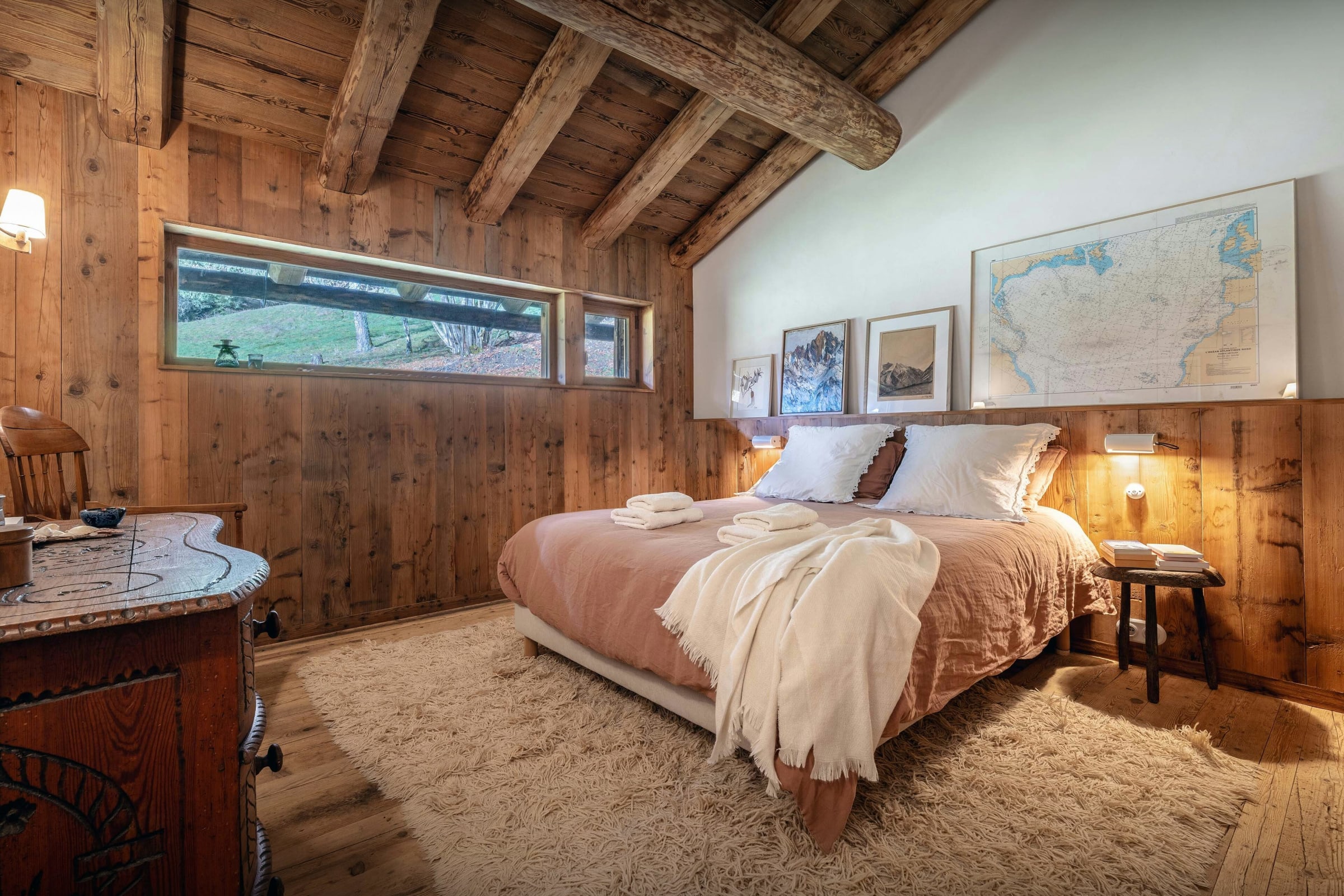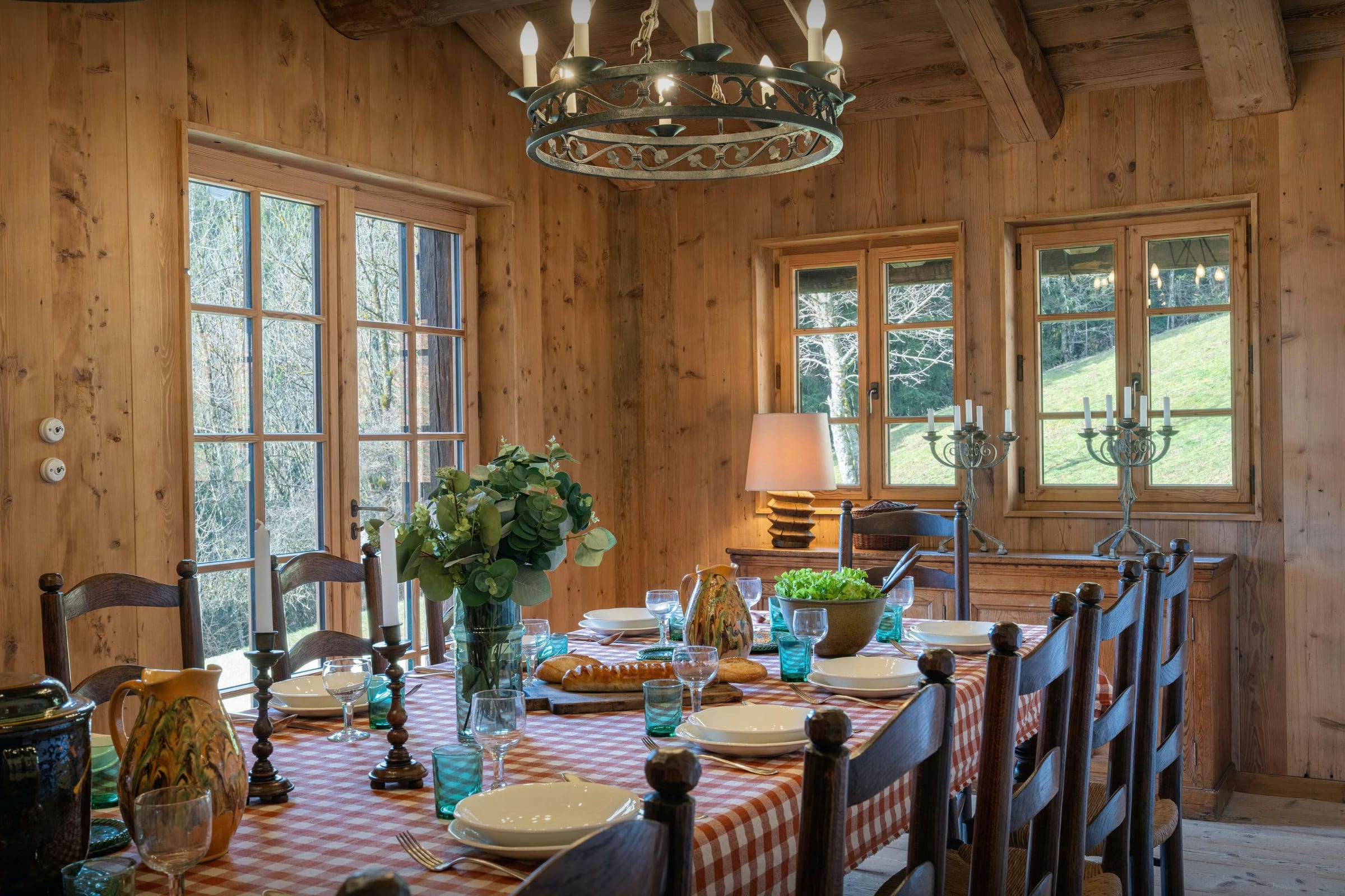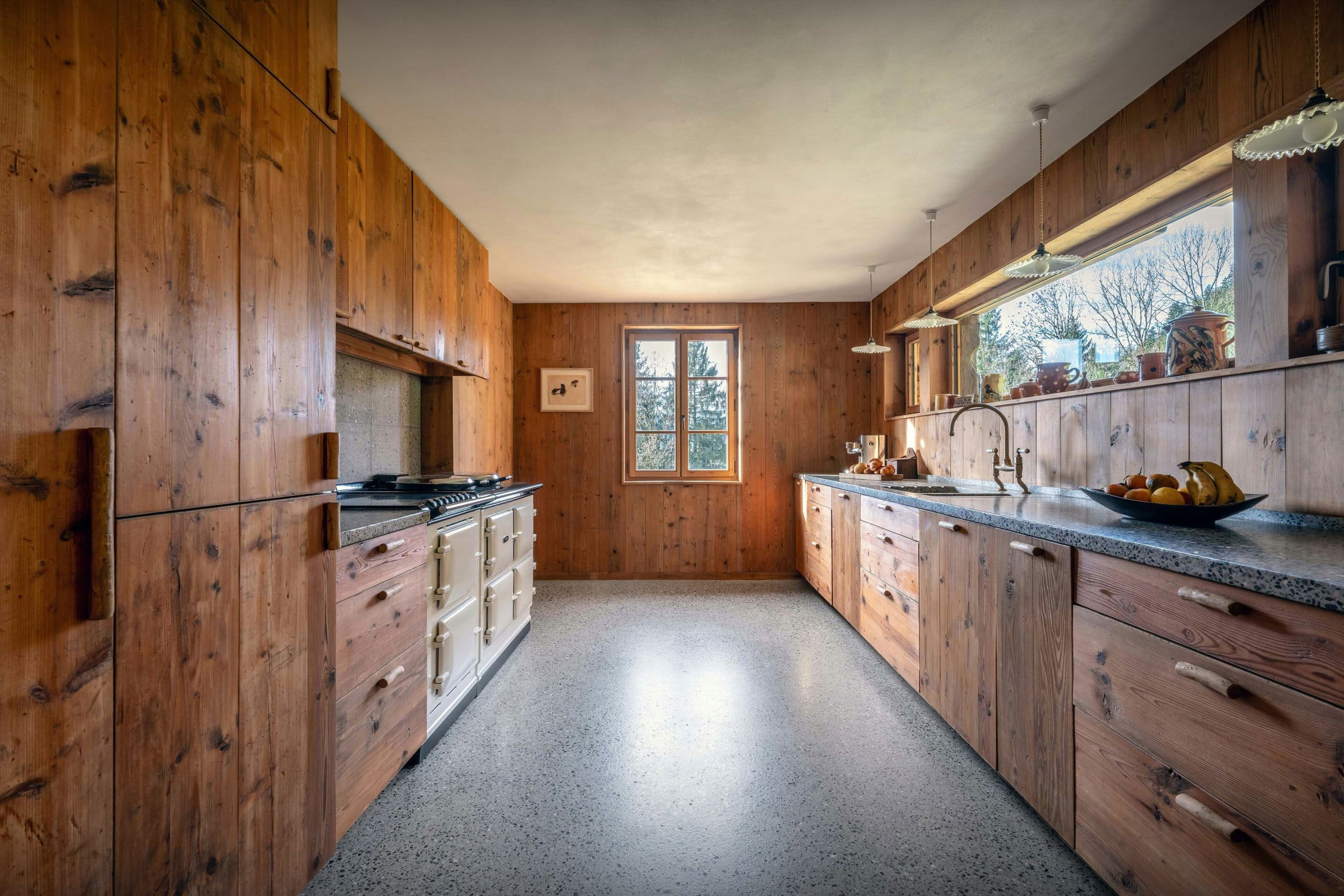 Das Wohnzimmer dieses ehemaligen Bauernhauses aus dem Jahr 1805 besticht sofort durch seinen rustikalen Charme und seine behagliche Atmosphäre. Rund um den Kamin laden die Sofas zu gemütlichen Abenden ein, bei denen man ein Buch aus der griffbereiten Bibliothek zur Hand hat. Durch die Flügeltüren des Balkons strömt viel Licht herein und bietet einen atemberaubenden Blick auf den Tournette-Berg.