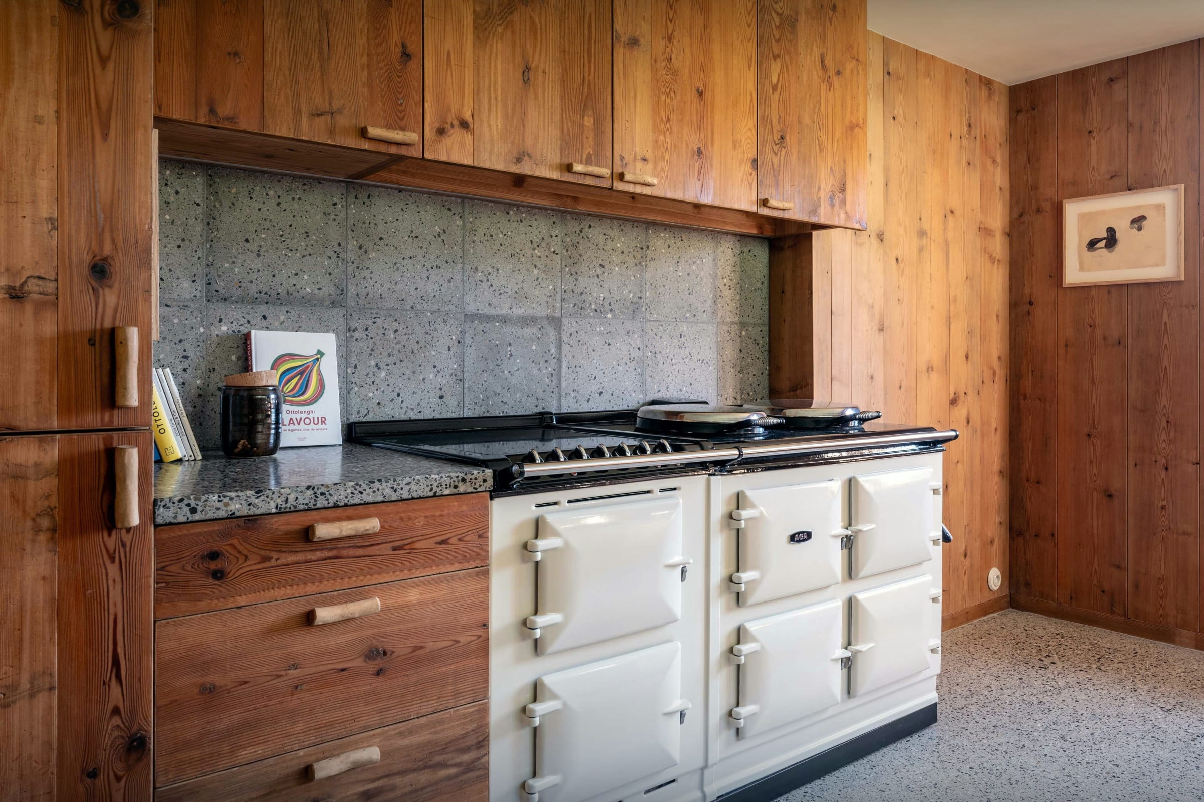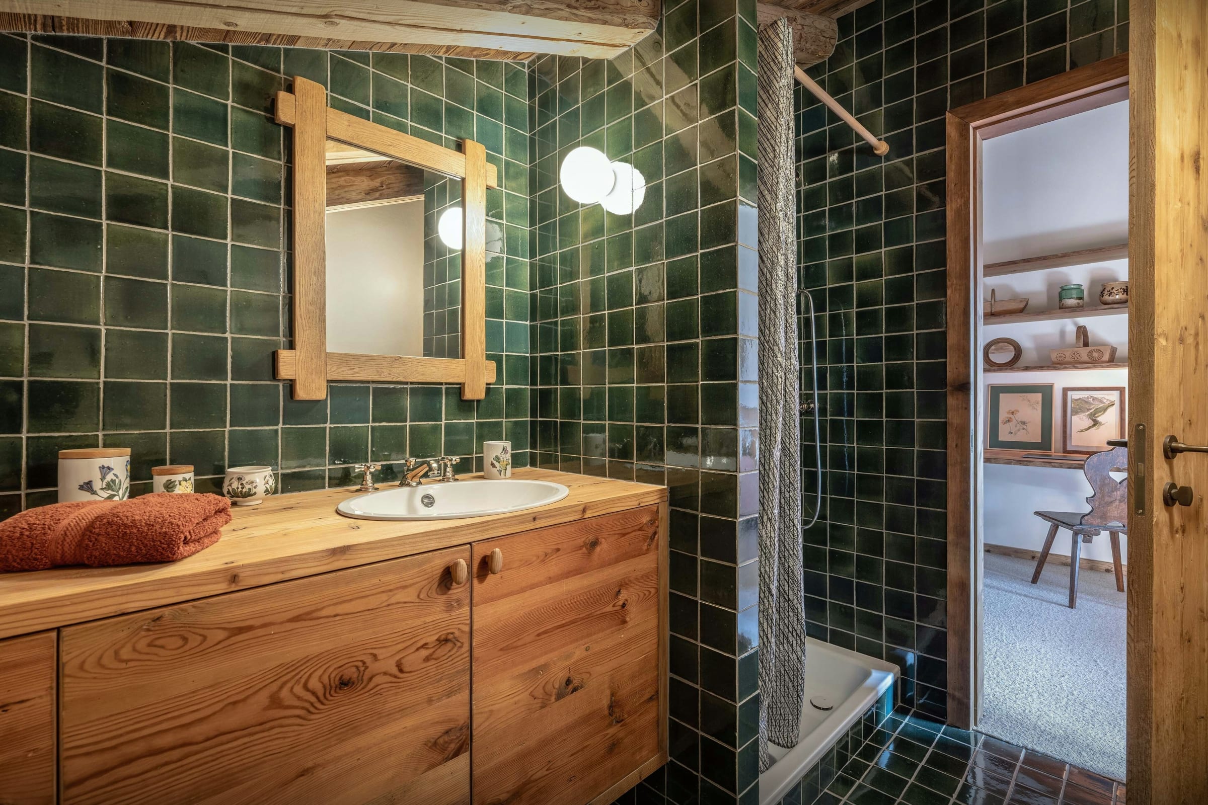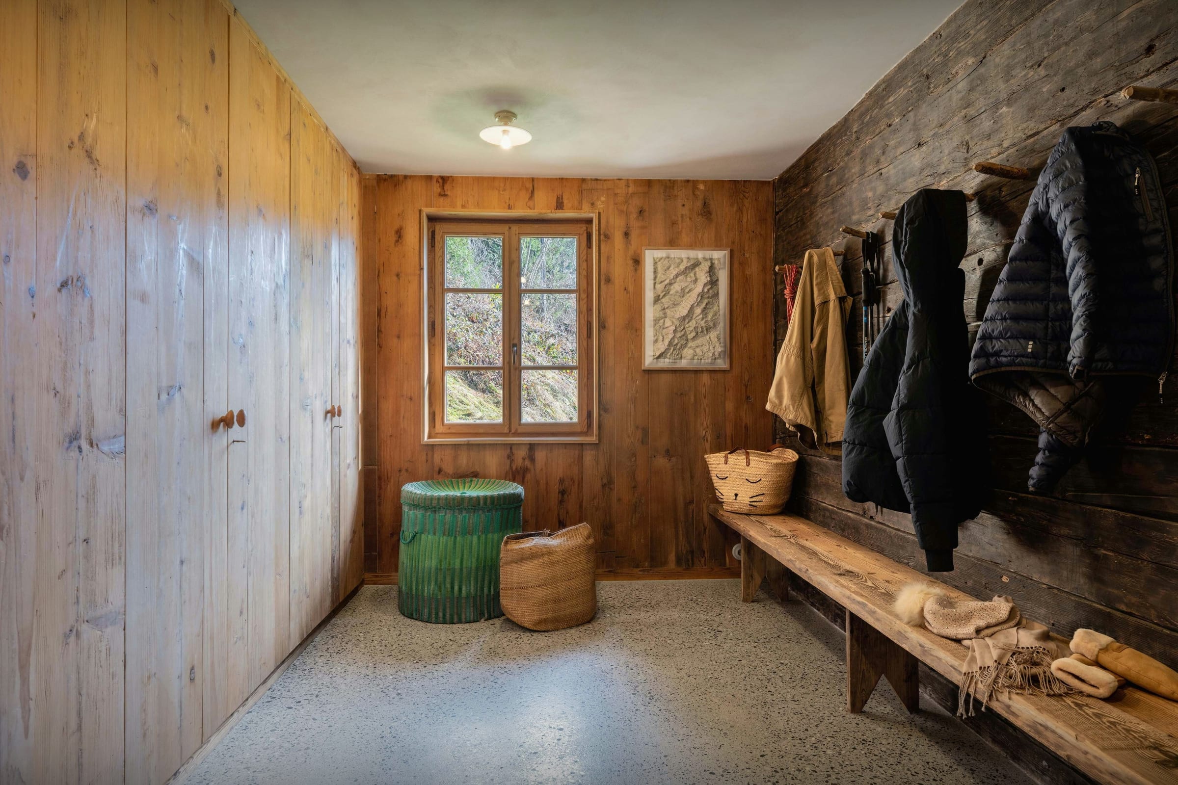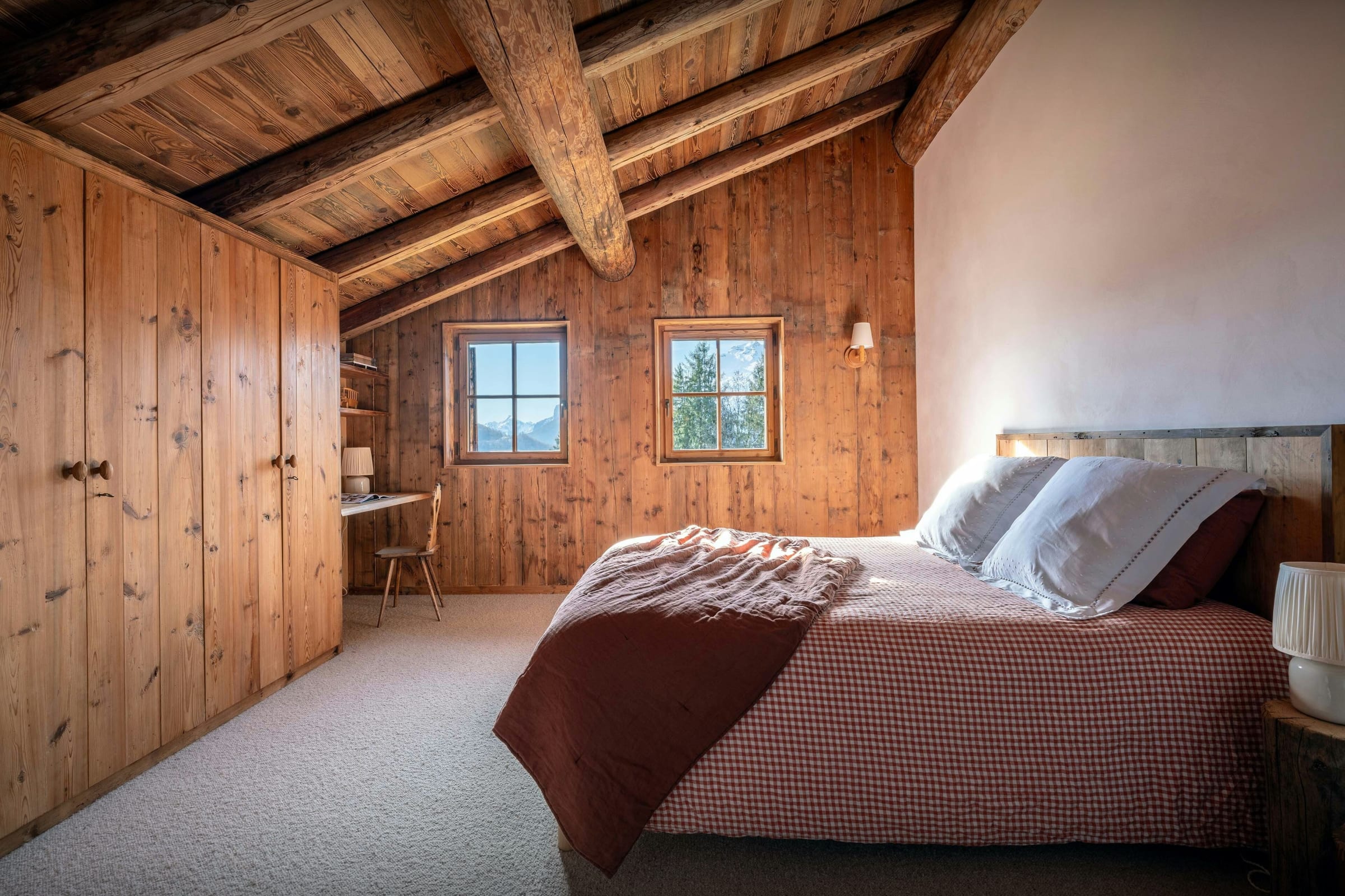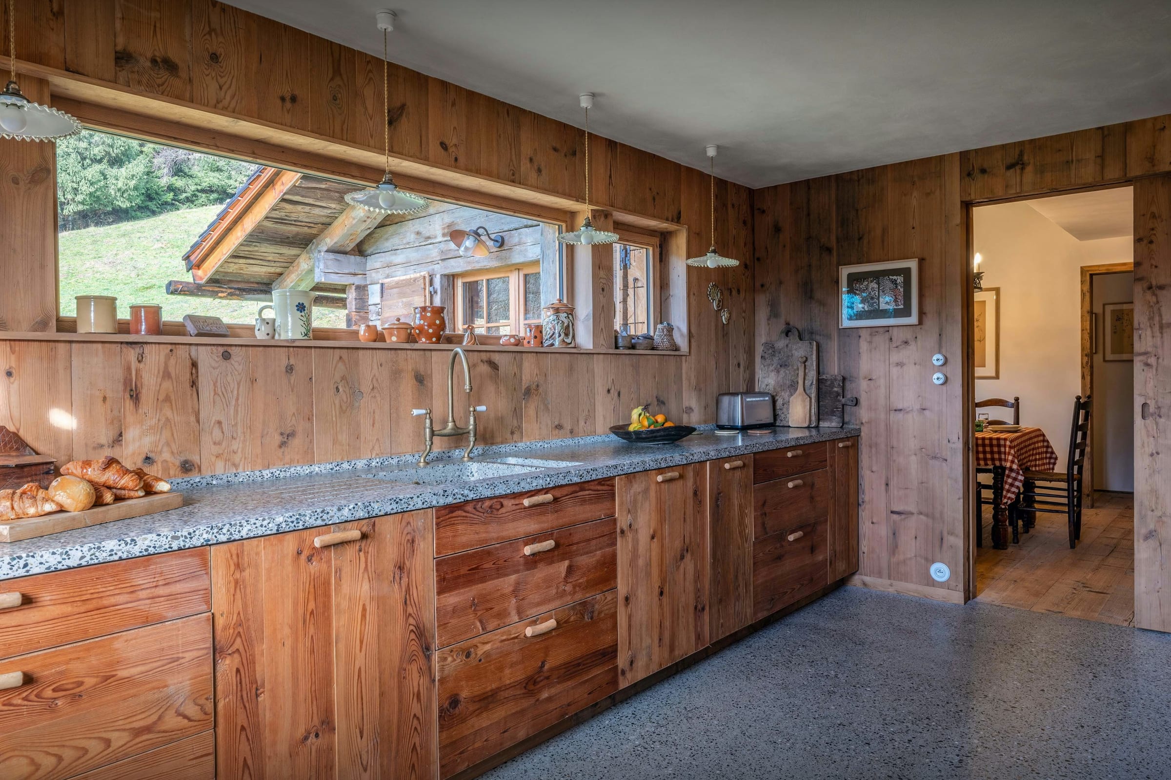 Das Wohnzimmer dieses ehemaligen Bauernhauses aus dem Jahr 1805 besticht sofort durch seinen rustikalen Charme und seine behagliche Atmosphäre. Rund um den Kamin laden die Sofas zu gemütlichen Abenden ein, bei denen man ein Buch aus der griffbereiten Bibliothek zur Hand hat. Durch die Flügeltüren des Balkons strömt viel Licht herein und bietet einen atemberaubenden Blick auf den Tournette-Berg.