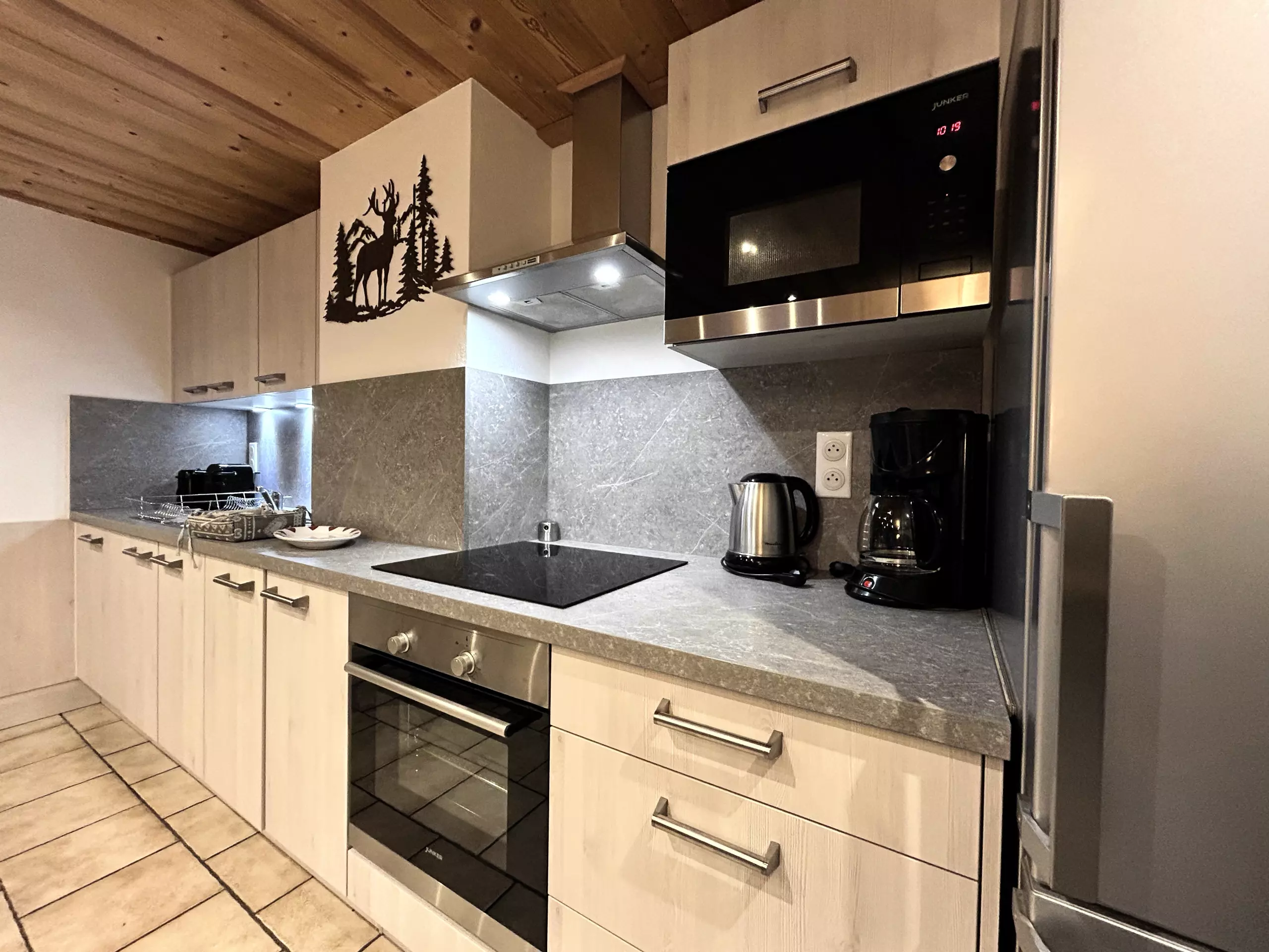 WOHNZIMMER/KÜCHE: (Fliesenboden), 2-Sitzer-Schlafsofa (140 cm), Fernseher, Südbalkon mit Gartenmöbeln (Tisch, 3 Stühle und 3 Liegestühle), Westfenster, Essbereich, Spüle, 4-Platten-Induktionskochfeld, Backofen, Mikrowelle, Geschirrspüler, Kühl-/Gefrierschrank, Filter- und Kapselkaffeemaschine, Toaster, Mixer, Raclette- und Fondue-Sets, Küchenschränke mit allen notwendigen Utensilien, Hochstuhl